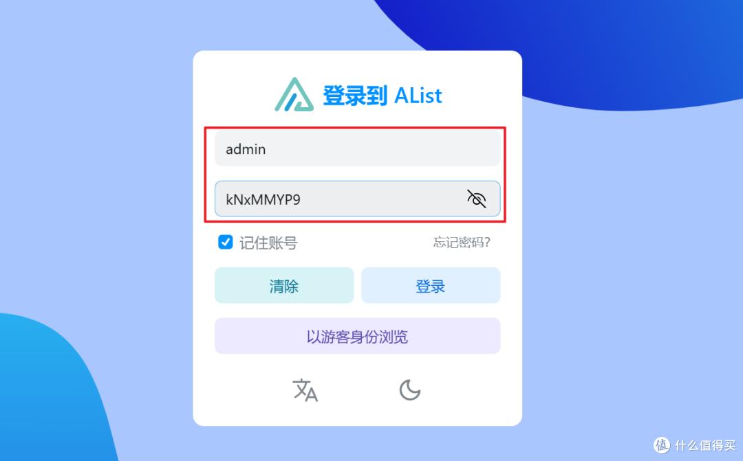 然后浏览器输入【极空间IP:端口号】打开Alist的Web页面。账号为“admin”,密码就是上一步复制下来的随机密码。