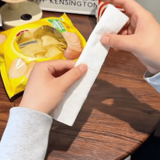 有一天,看女儿吃薯片,她特意叠了张纸,类似一次性手套,把手指套进去,吃完手干干净净。
