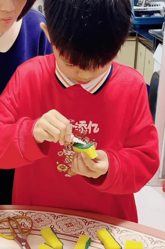 我才知道是孩子把海绵裁成细条,一根根粘到洗碗手套上的。