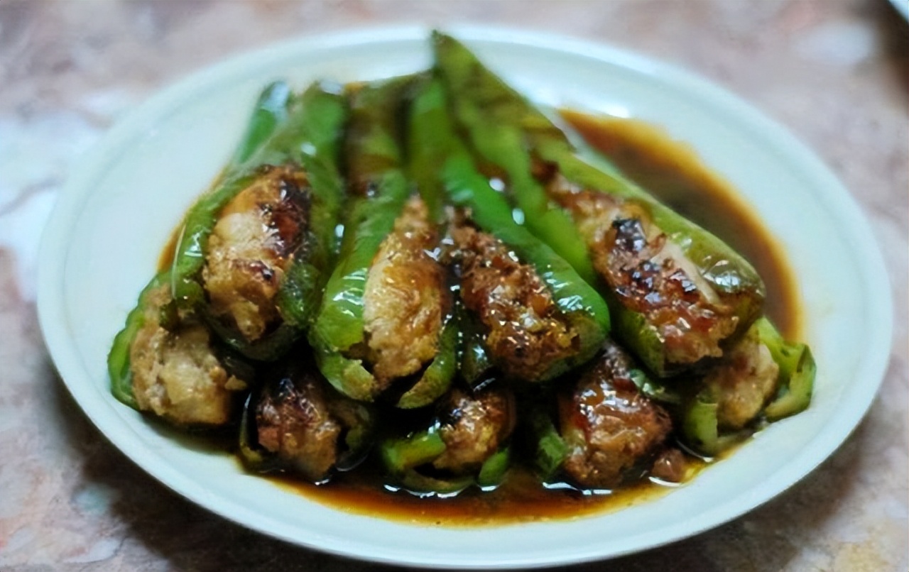 2.起锅烧油、下入酿好的青椒煎至虎皮微焦出锅备用。