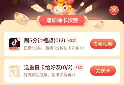 在抖音极速版的团圆家乡年活动页面,点击【增加抽卡次数】查看可以完成的任务,注意,日常任务只能获得金币,无法获得抽卡次数,完成任务要求,可获得对应的抽卡次数,点击抽卡,获得大量抽卡次数之后,有极大的几率可以获得自己缺少的卡;
