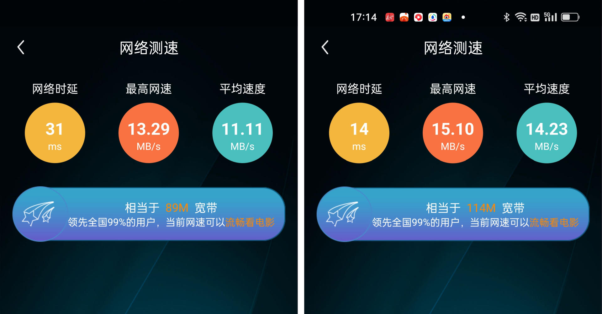 在客厅和主人房测试了最高网速,客厅是15.1MB/s,而主人房因为延迟降低到13.29MB/s,使用手机下载1GB的手游,用时1分钟50秒,下载的速度还算不错。