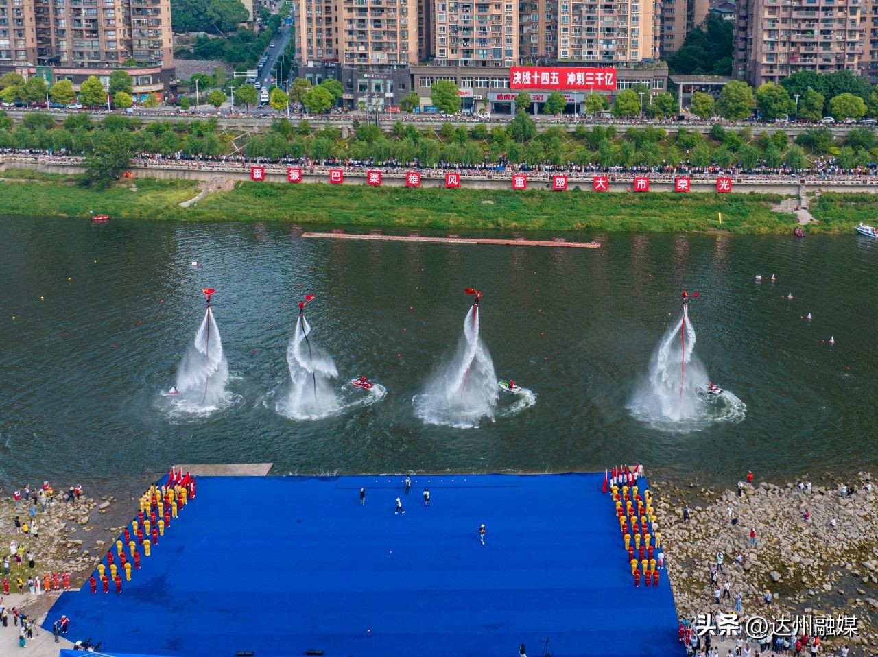 当日9时,主办方在达川区三里坪游泳基地举行了开幕式。开幕式上,精彩的动力滑翔伞表演、水上特技表演以及法门武术、安仁板凳龙等本地特色节目表演赢得阵阵喝彩。35支龙舟队逐一入场亮相,随后举行披红、点睛仪式。