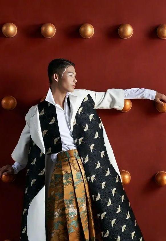 用西装代替繁琐的袄、衫,酷帅的同时又不失优雅。西装与马面各取所长,在搭配时,要注意两者颜色相容、风格统一,避免出现割裂感,造成整体搭配的不协调。
