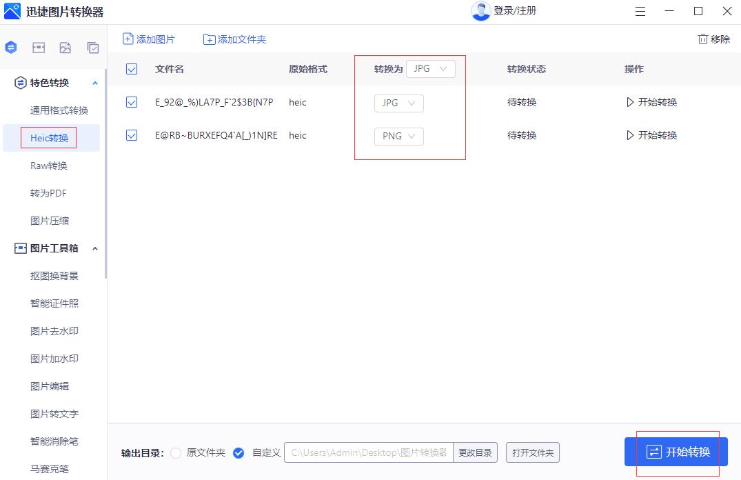 打开软件,点击【Heic转换】,添加图片,可以同时添加多张图片,然后选择想要转换成的格式,多张图片可以选择不同的转换格式,接下来点击【开始转换】就可以了。
