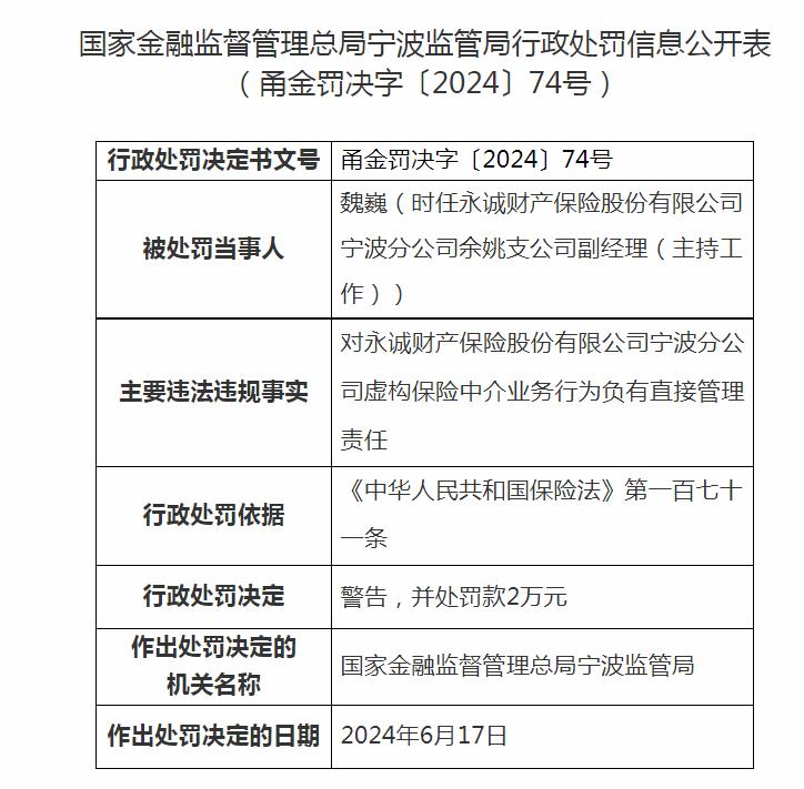 近日,国家金融监督管理总局宁波监管局行政处罚信息公开表(甬金罚决字〔2024〕72号)显示,永诚财产保险股份有限公司宁波分公司因业务数据不真实、虚构保险中介业务被行政处罚,依据 《中华人民共和国保险法》第一百七十条、第一百六十一条,行政处罚决定:警告,并处罚款合计42万元。 同时,对3名当事人警告、罚款2万元。