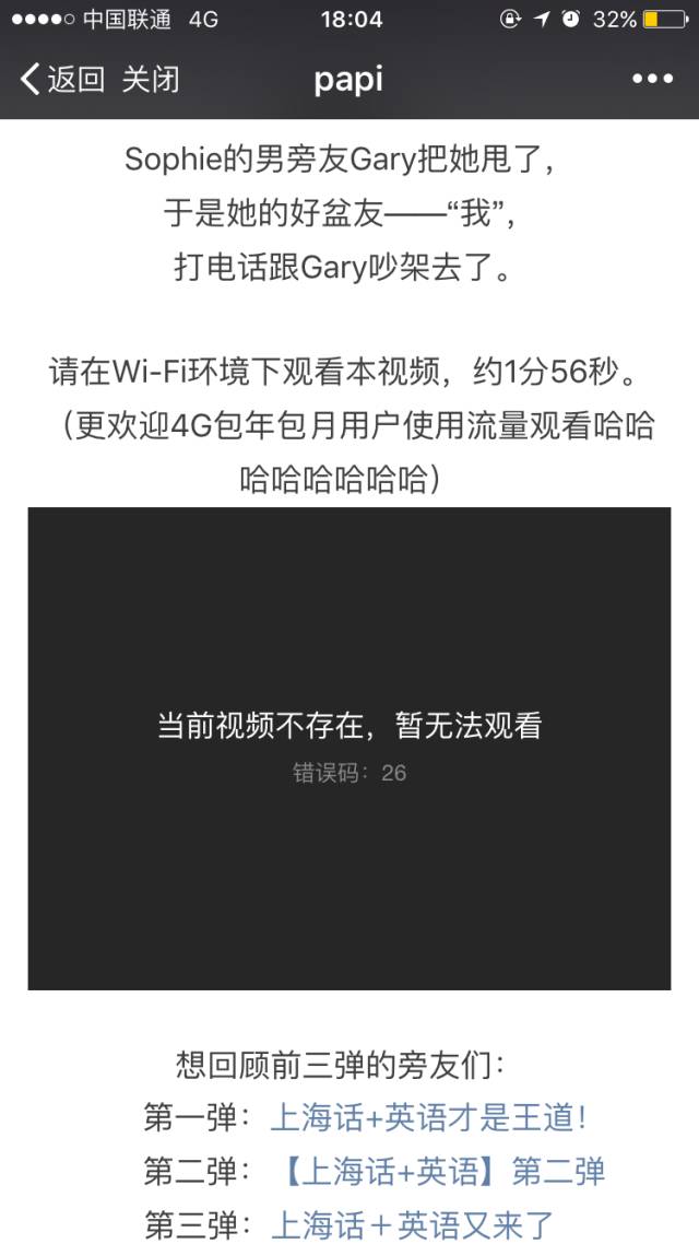 papi酱的微信公众号最新(4月11日)推送的“上海话+英语第四弹”里面的视频,也已经无法播放。