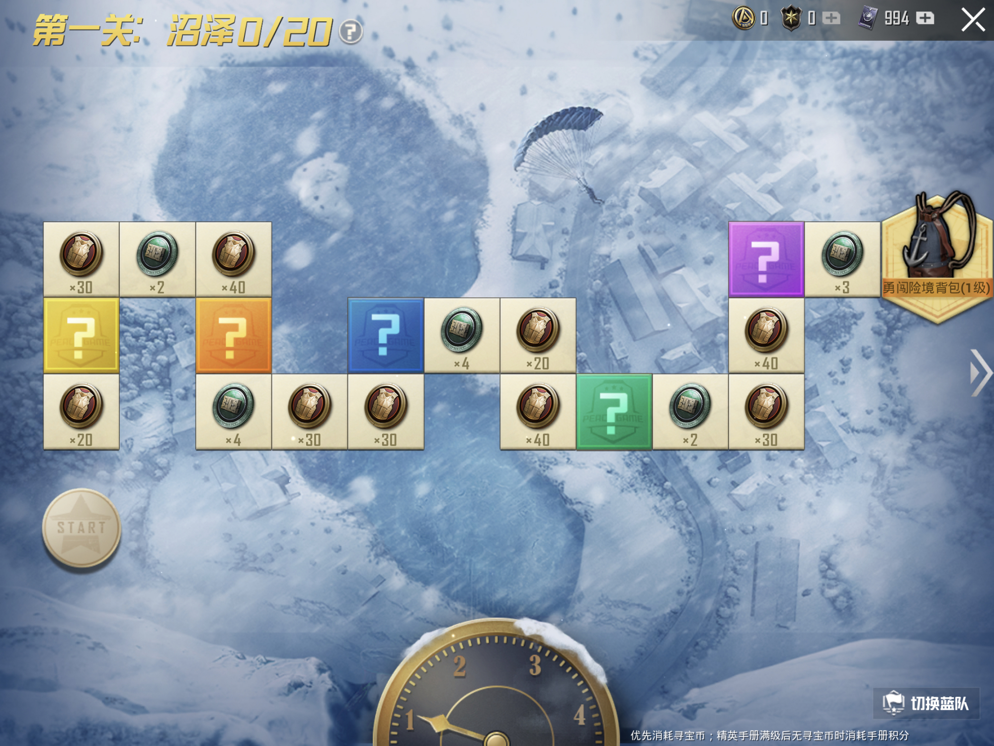 上图所示是蓝线的第一关,看到这张图后我有点懵。光子也忒会玩了吧,硬是在和平精英里面建造了一个闯关小游戏。玩家在前进的时候走到哪个格子上面就会获得相应格子的奖励,从图片中我们可以看到有物资币,有服饰币,还有带问号的格子。这些问号格子是什么意思呢?