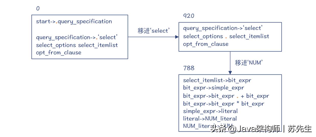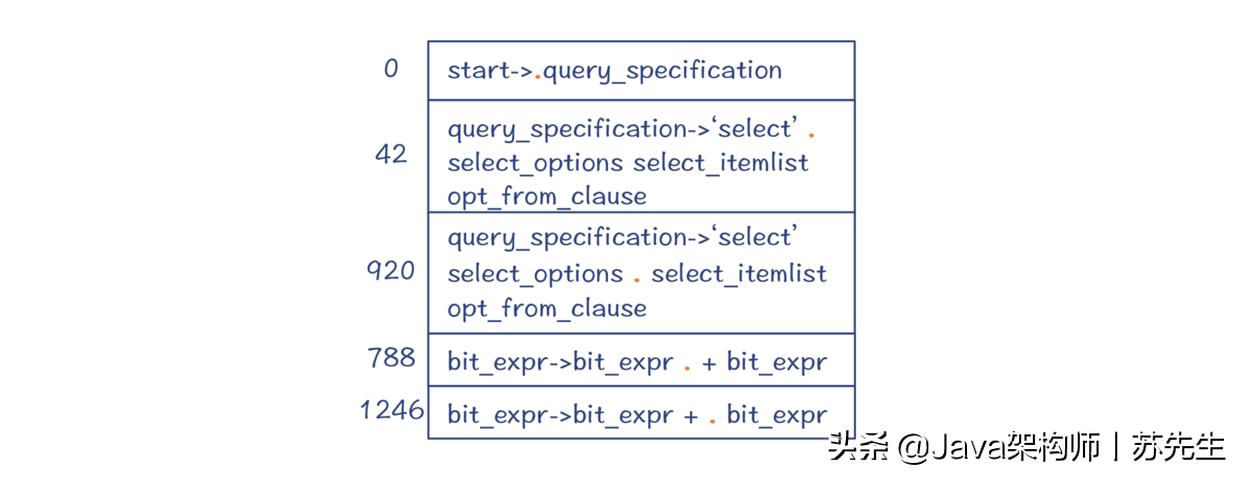 也就是,编译器依据“select_options->ε”做了一次规约,并进入了新的状态 920。注意,状态 42 和 920 从 DFA 的角度来看,它们是同一个大状态。而 DFA 中包含了多个小状态,分别代表了不同的规约情况。