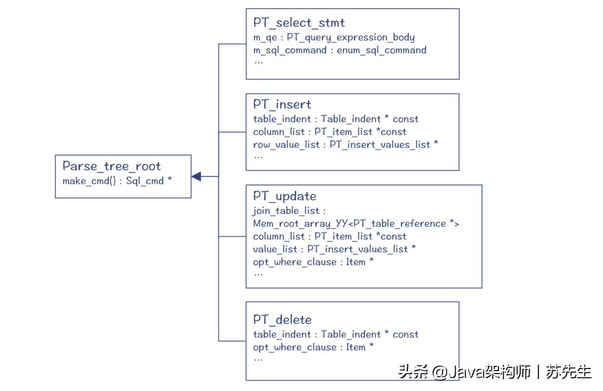 由于 SQL 是一个个单独的语句,所以 select、insert、update 等语句,它们都各自有不同的根节点,都是 Parse_tree_root 的子类。