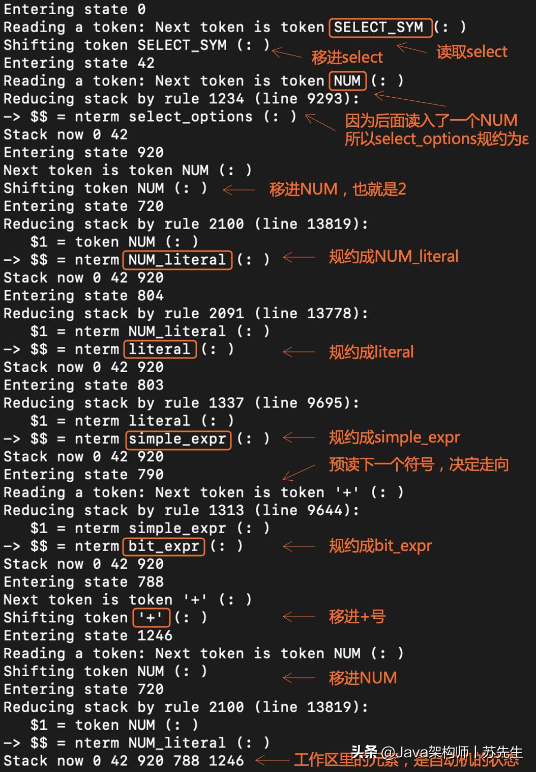 mysqld --debug="d,parser_debug"然后,你可以通过客户端执行一个简单的 SQL 语句:“select 2+3*5”。在终端,会输出语法分析的过程。这里我截取了一部分界面,通过这些输出信息,你能看出 LR 算法执行过程中的移进、规约过程,以及工作区内和预读的信息。