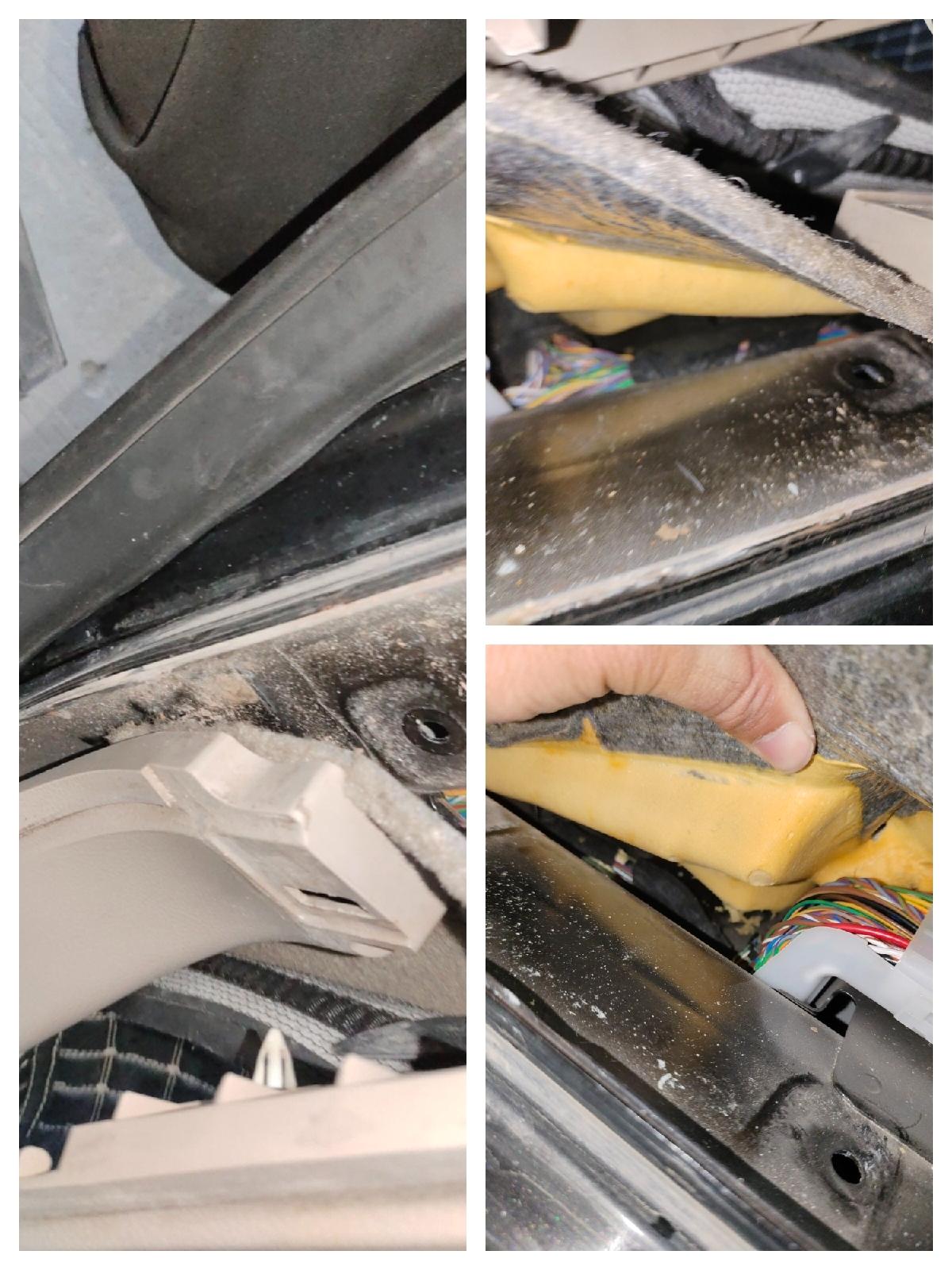 转向柱和座椅下部骨架生锈,地毯下面线束重新包裹,胶带的成色很新,而且线束已经全都剥开了,综合顶棚更换和周边ABC柱饰板变色的情况,阿垚怀疑内饰进过水,但是没有更多的证据来支撑论证!