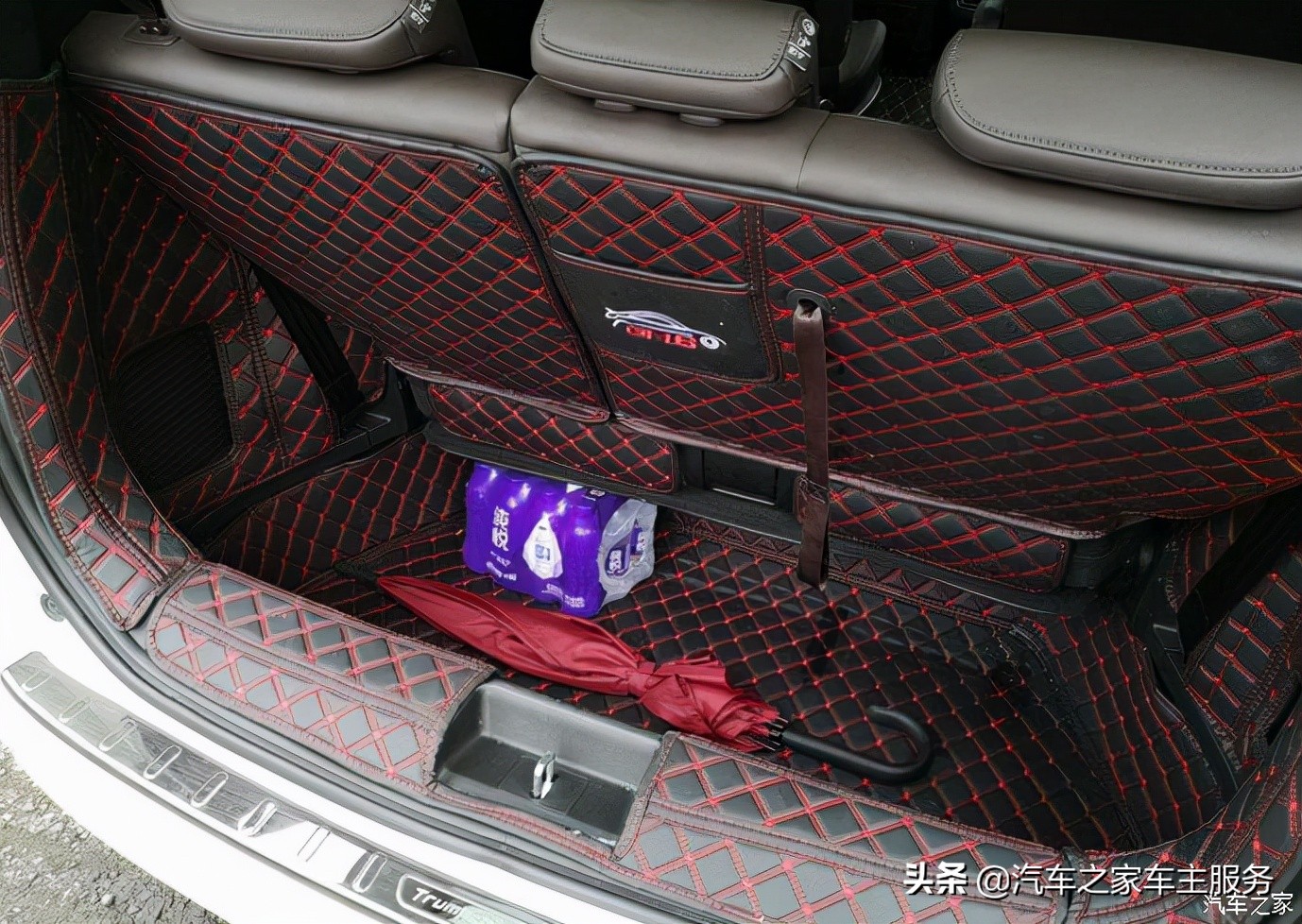 这个下凹的空间我觉得是设计师用心的证明,如何提升一辆车的空间利用率?这就是一个很好的办法。我放过折叠的婴儿车,放过中等大小的行李箱,甚至还放过一袋大米,都能完美地嵌入到这个空间里面,即便是满员出行,也可以放很多人的行李。