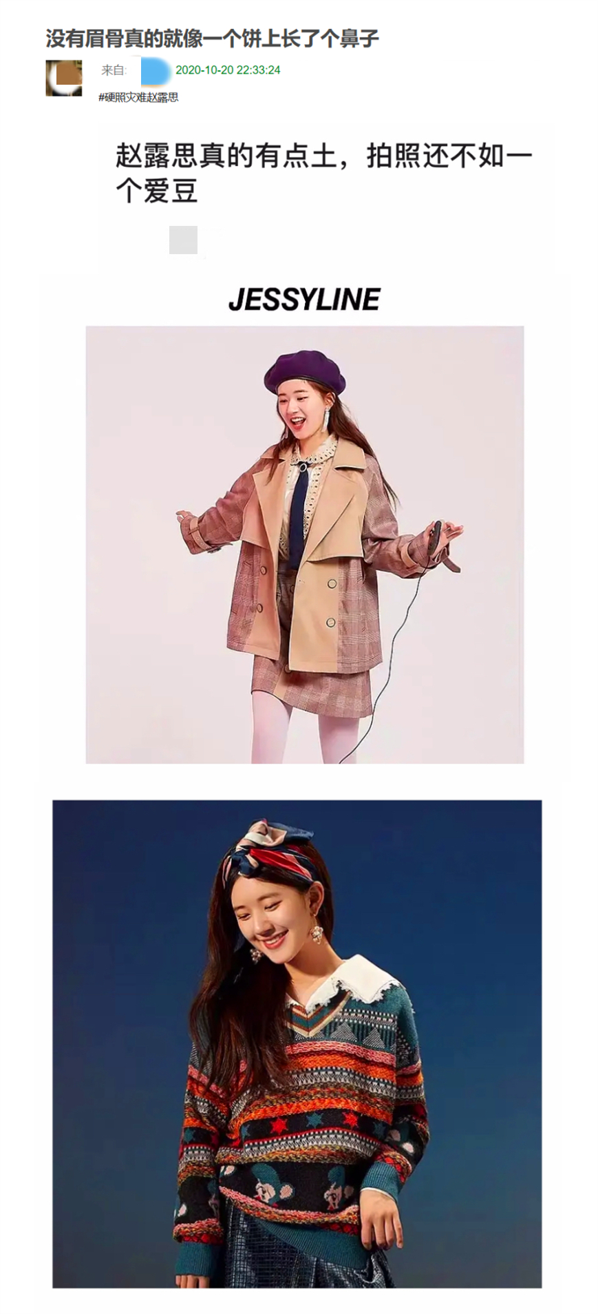 近日,赵露思为女装品牌Jessyline拍摄了一组广告大片。但照片曝光之后,有网友说赵露思"土",还说"没有眉骨,真的就像一个饼上长了个鼻子"。这句话听着确实不那么好听,也有点冒犯人,可说的却是事实。熟悉赵露思的人都知道,她是个甜美可爱的女孩子,眼睛大,鼻梁也高,可惜就是眉骨不高不明显。