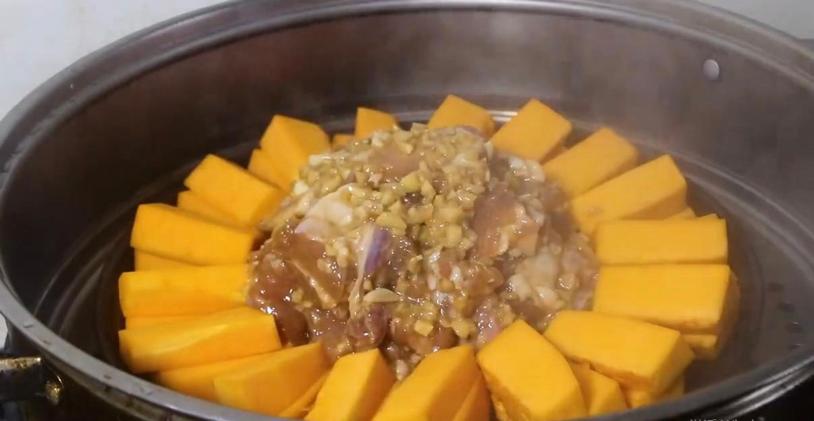 7.起锅,加入适量清水,水开后,放上蒸笼,接着把盛有排骨和南瓜的盘子放进去,盖上锅盖,大火蒸二十五分钟左右。