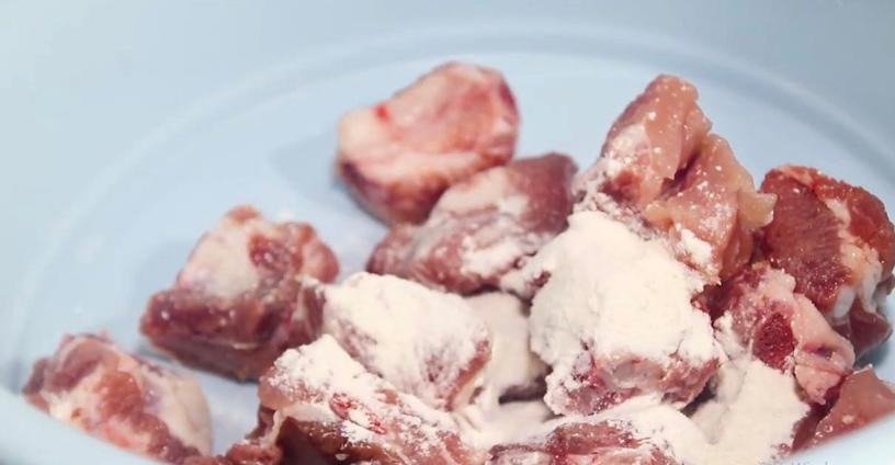 4.充分抓匀后,再加入一勺淀粉,用手再次抓拌均匀,使每一块排骨表面都能裹上淀粉。最后,放在一旁腌制半个小时左右。