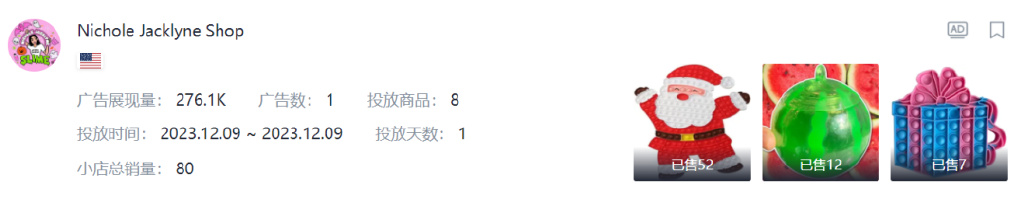 1.NICHOLE JACKLYNE SHOP:该小店以圣诞老人拼图这一益智玩具斩获美国TikTok广告展示量的榜首,主要是借势了圣诞节元素,提升了广告视频的热度。该店以低单价的居家日用商品为主,种类繁多,本周有1名粉丝量为1M的带货达人为其带货。