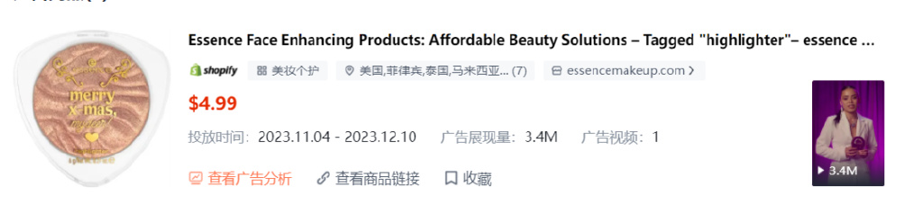 2.ESSENCEMAKEUP.COM:该小店以修容粉这一产品获得了3.4M的展示量。广告创意主要体现在增强用户对产品的信任上,主要通过视频广告展示获奖现场以及使用效果。