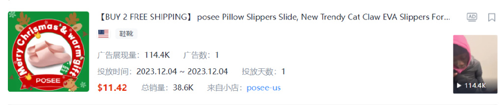 3.POSEE-US:以鞋子广告视频推广,获得114K的展示量,小店内商品以休闲拖鞋为主。广告创意同样是通过故事的演绎将鞋子的广告植入其中。该小店本周内找过众多达人带货,其中前三名带货达人的粉丝量分别为:571.2K、111.7K、109.7K。