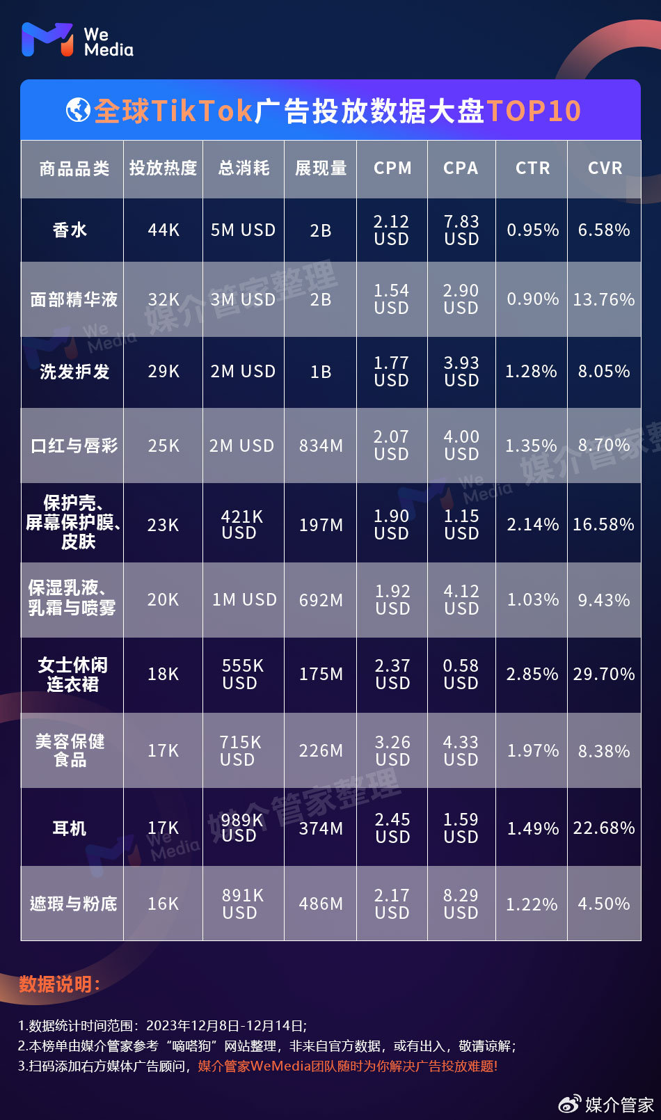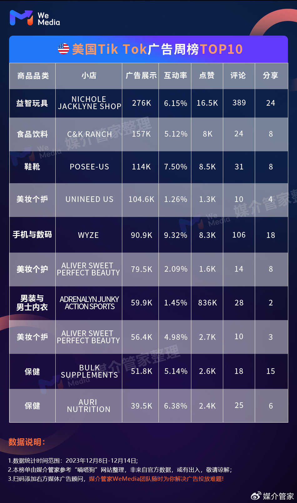 以上是媒介管家WeMedia本周分享的广告投放榜单。如今,TikTok已经成为出海企业不得不重视的一个赛道。它凭借其庞大的用户群和日益普及,正迅速成为美国电商卖家接触新客户和发展业务的热门平台。本期分享到这里,欢迎大家关注,媒介管家WeMedia广告周刊将会为你持续更新!敬请期待~