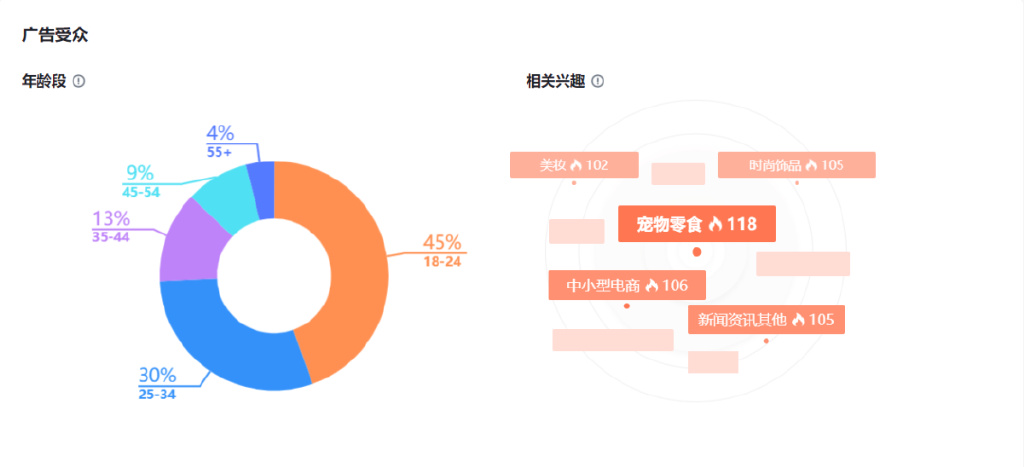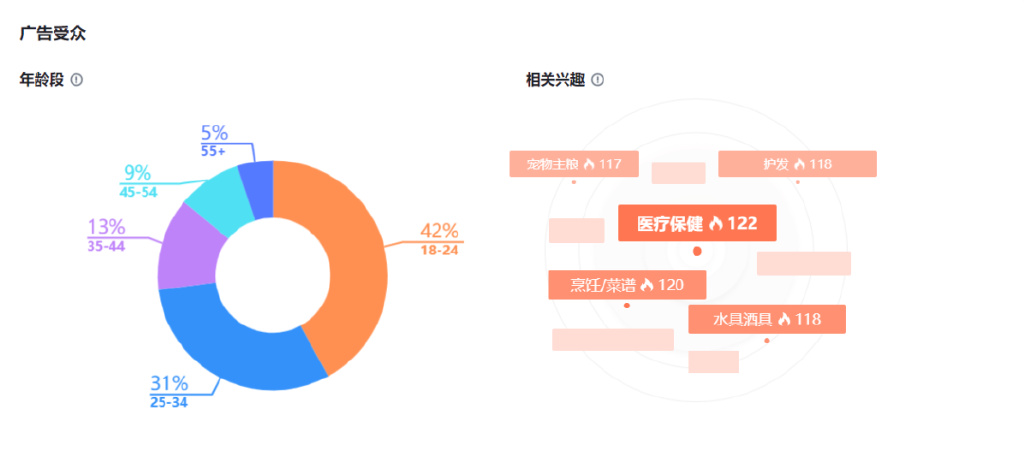 3.洗发护发:此类商品广告受众18-34年龄段占比有所上升,从原来的73%上涨到75%。此外,受众感兴趣的话题与上周一样。