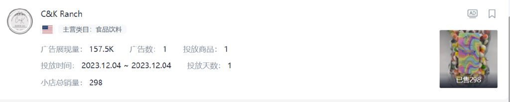 2.C&K RANCH:以彩虹棒广告视频获得157K广告展示量,小店内商品比较单一,以各种品牌的彩虹棒为主。广告创意是通过故事演绎的形式突出商品特点。该小店在本周只有1名粉丝量为24.6K的带货达人为其带货。