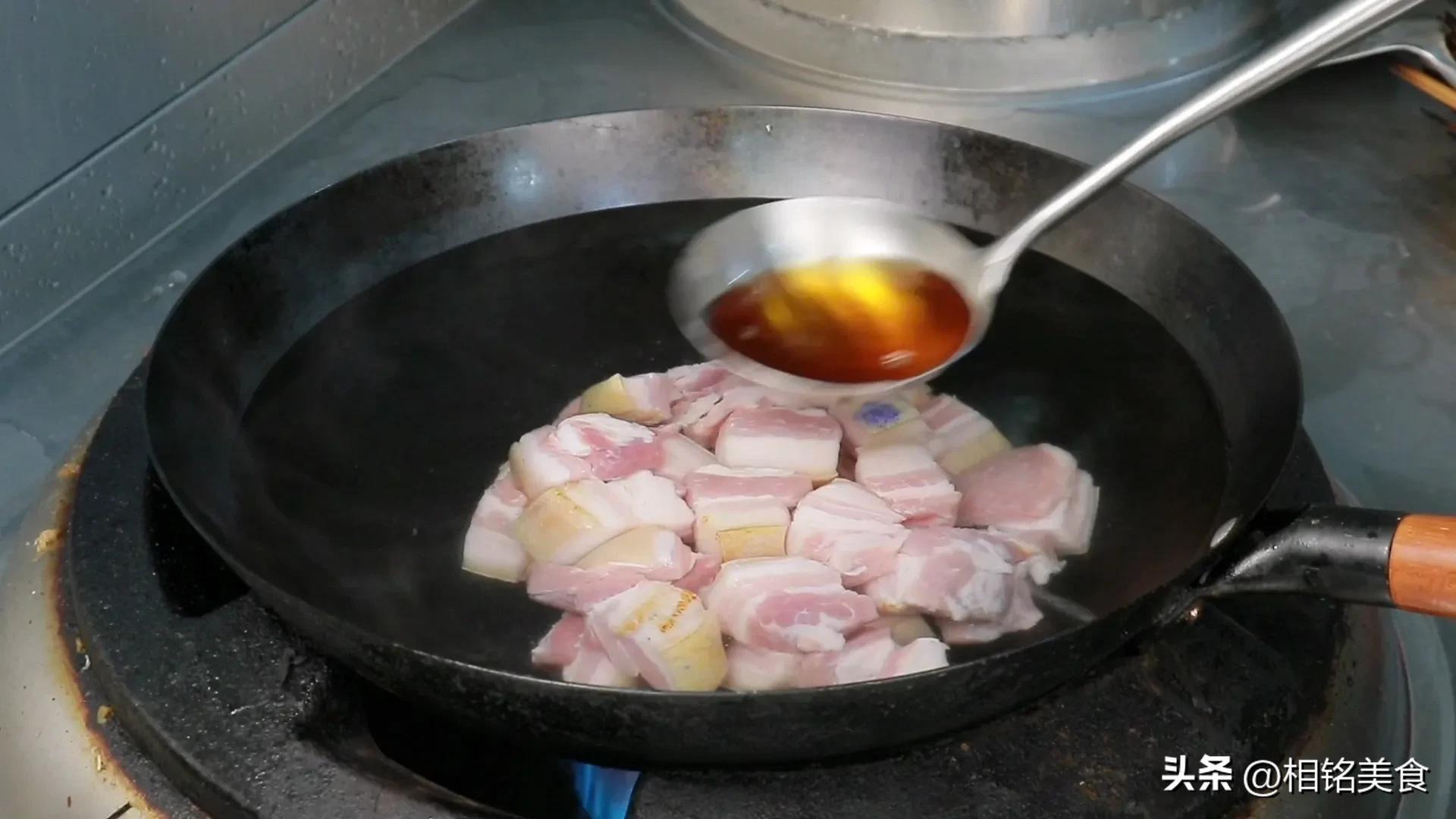 不能炒太干,太干了的话,瘦肉吃起来发柴,炒至五花肉颜色微黄,出油以后就可以了,炒出来的油不要倒掉,可以留着炒菜,味道特别香;