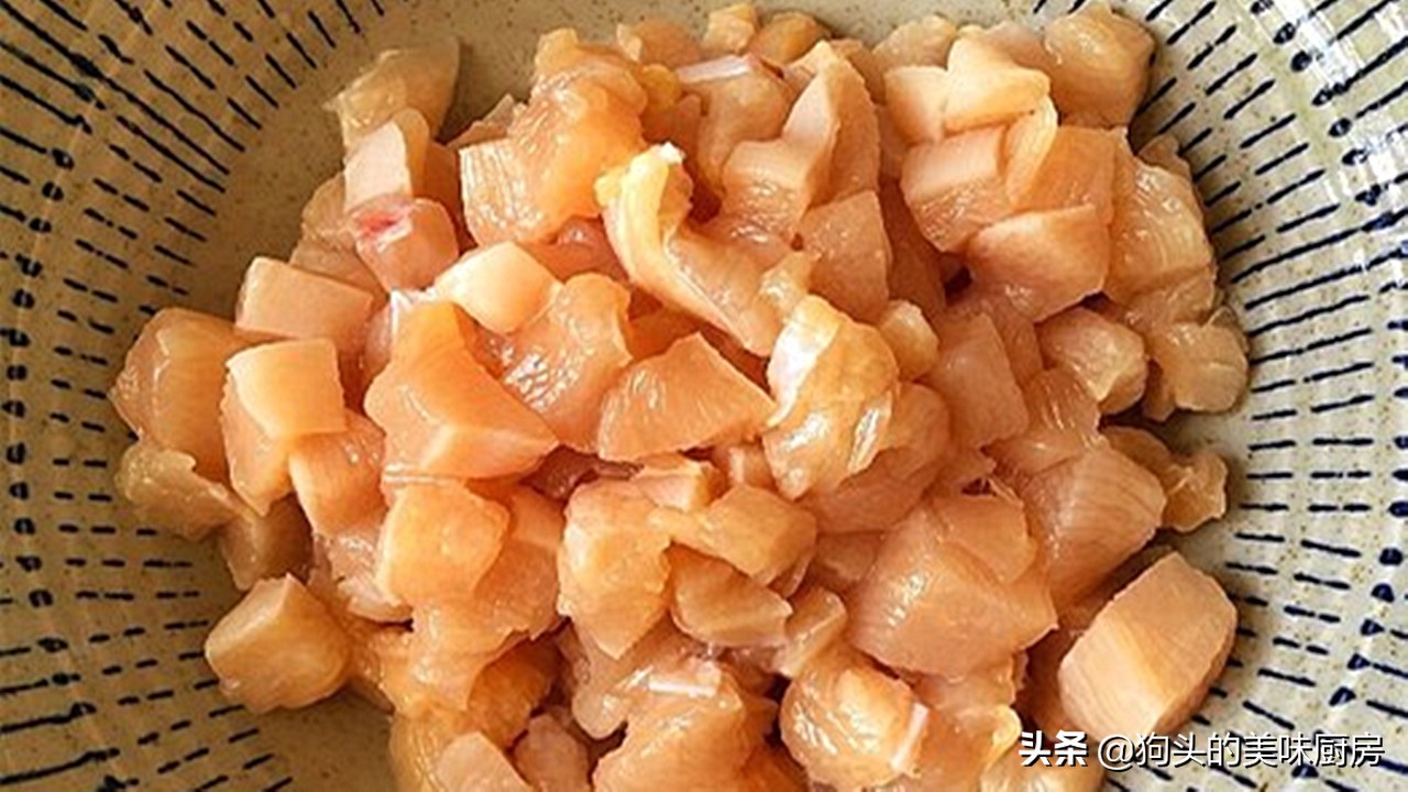 1.准备一块鸡胸肉,清洗干净,先切成条,然后切成碎丁,不要太大块,也不要太小。放入碗中,调入适量料酒,先腌制五分钟去去腥。一块鸡胸肉是三个饼的量,想吃多点就多准备多一点。