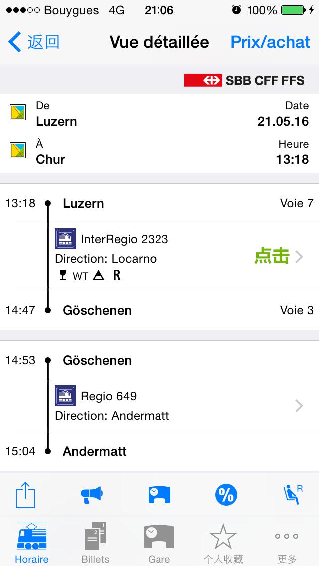 a) 红色圆圈里是你选择的列车的详细信息,包括换乘的车站,换乘的时间,每次乘车的站台以及每段所运行的列车种类(瑞士列车种类的介绍我会贴在攻略下面)。一般换乘时间都在十分钟以内,不过因为瑞士超高的列车准点率,时间完全够用。