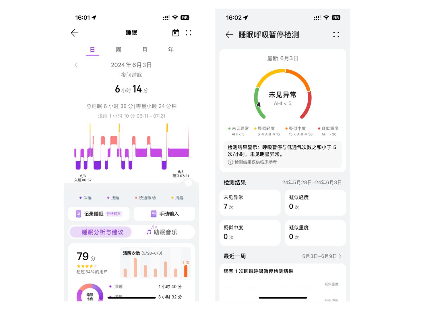 在睡眠记录里,除了常见的深睡、浅睡、眼动睡眠和清醒次数等数据,睡眠呼吸暂停检测是华为WATCH FIT 3的亮点功能。它同样通过手表内置的高性能传感器,配合睡眠呼吸暂停筛查软件进行检测,实现了对睡眠呼吸暂停低通气综合征的初步筛查。