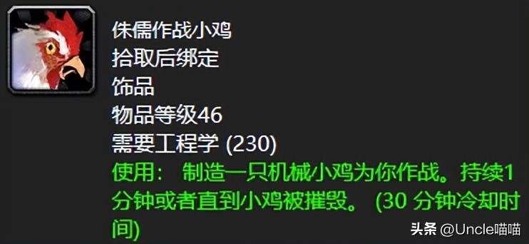 每每盘到侏儒作战小鸡,喵叔真的要和各位大兄弟诉诉苦,我曾好几次开心的在荆棘谷蹦跶,然后莫名血条直线下降,我勒个去的最后才发现是敌方小联盟盗贼在用此款侏儒作战小鸡在啄喵叔我的牛牛,真的是太惨了,如果在它持续的一分钟里你不给点反应制裁下,这丫的真的能给你活生生啄进天使姐姐的怀抱,实在残忍,还好有30分钟的冷却时间限制,不然真的是恐怖如斯了!