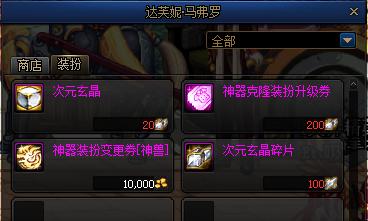 次元玄晶是商城新增的道具,售价为4000点券(本文计算方式为100点券=1元,不考虑折扣等因素)一个。路线一合成有小概率产出对应部位的神器天空,大概率产出为原有的稀有天空加5~10个次元玄晶碎片。