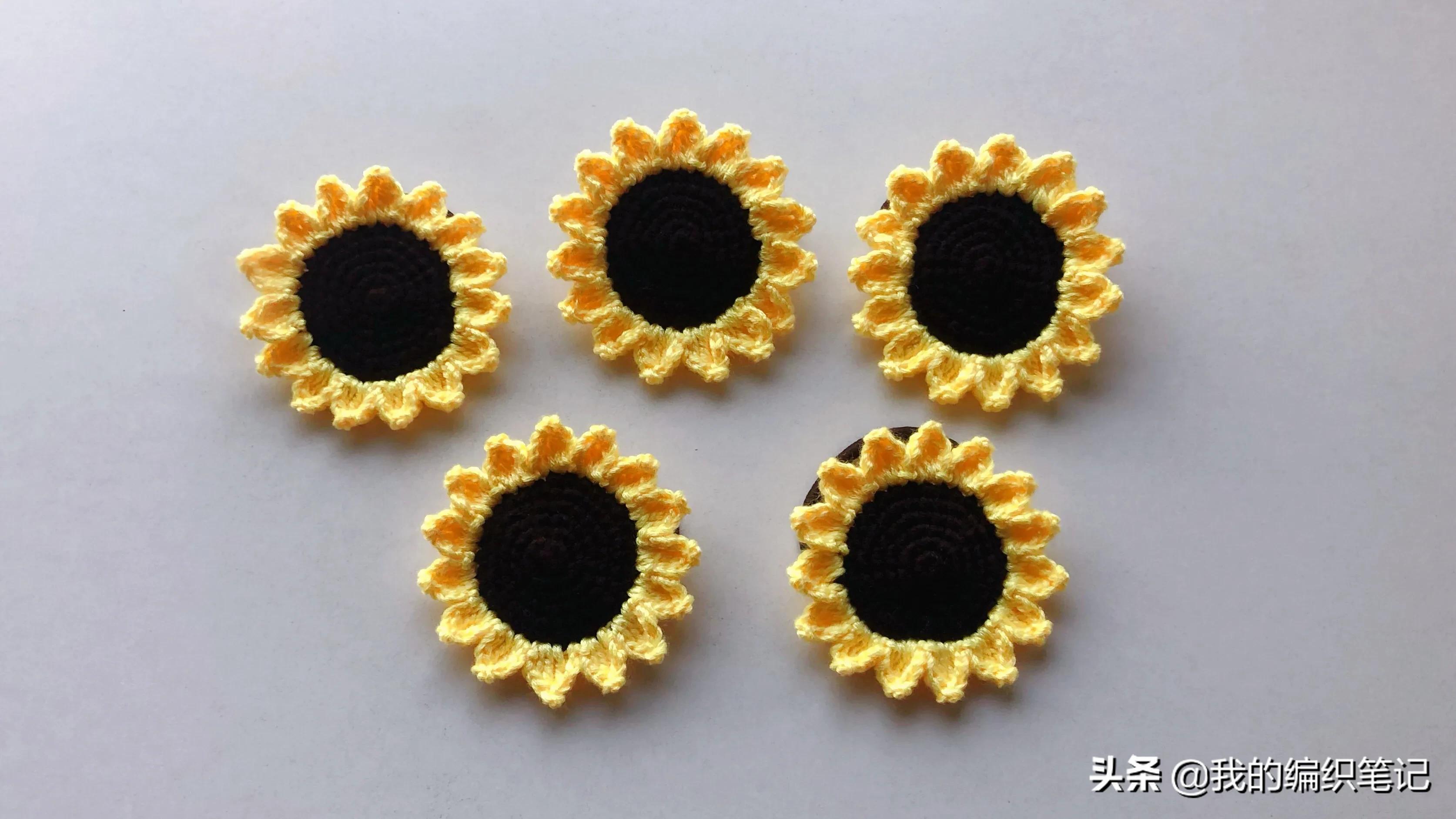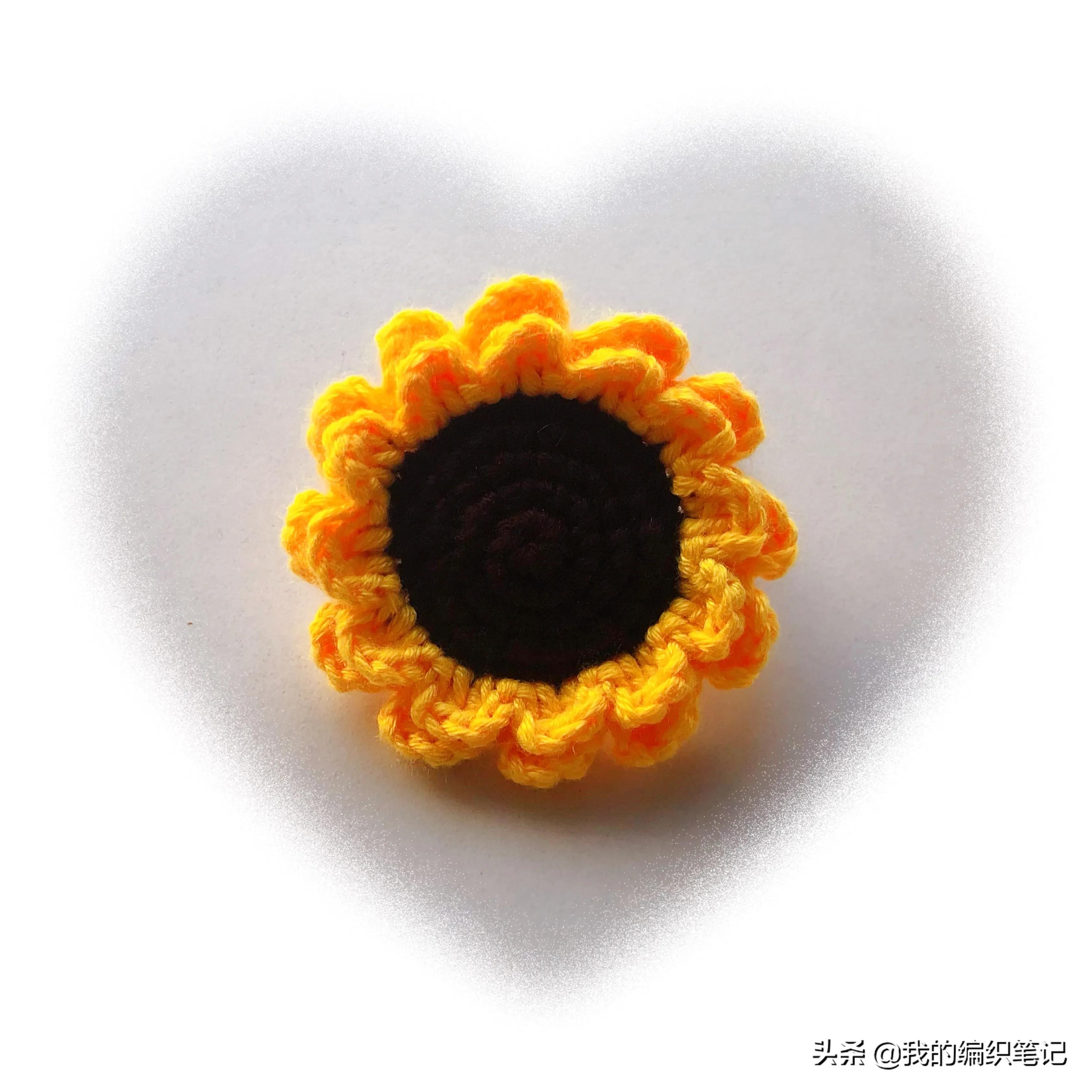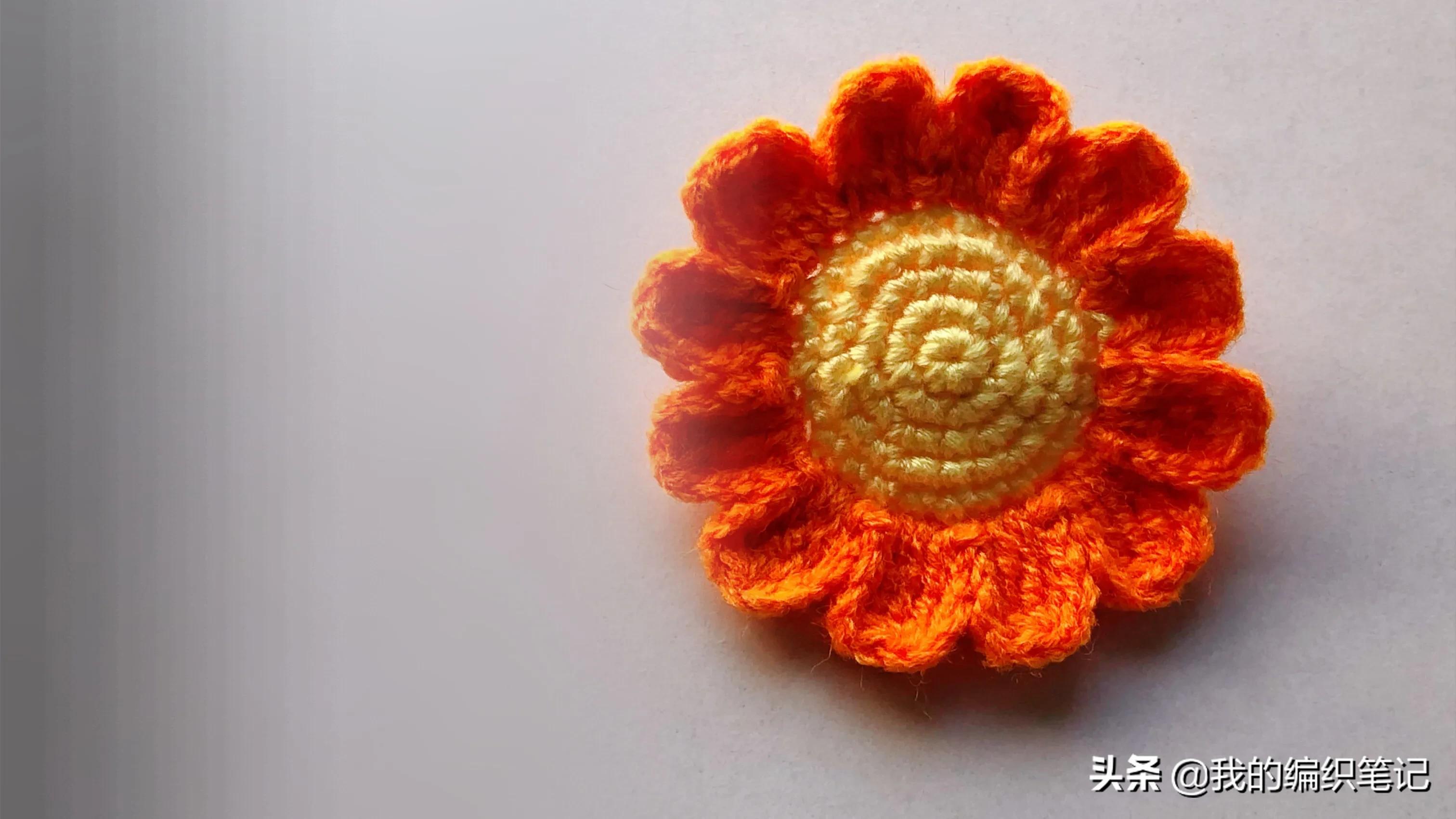 接(黄色)线来钩织(花瓣)每片各占2针目,每片花瓣之间钩S进行(过渡)分别依次对应(针目)共钩15片花瓣。