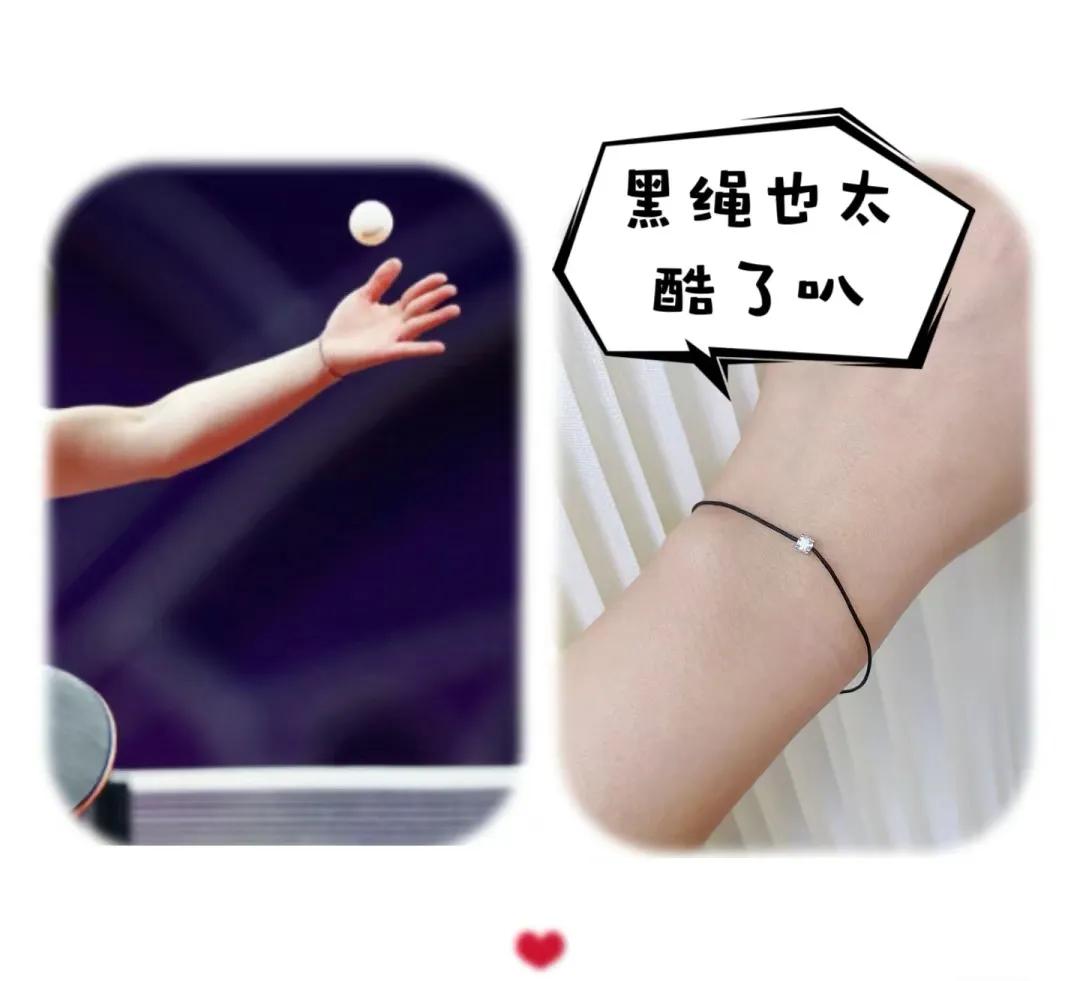 孙颖莎在2022年11月份黄石比赛生日过后带上一个黑色的手绳,但是细心的人发现黑色的手绳上有一颗耀眼的钻石,是一颗很简单的裸钻。在此之前跳水队的何姿也是带过一个红色的手绳,手绳上也是一颗简单的裸钻。但是这手绳却有独特的意义。秦凯2016年里约奥运会求婚何姿,这一幕被全世界观众见证,也让所有人才知道二人已密恋多年,二人的爱情长跑也成了体育界的一段佳话。由此也有了一绳一石也是一生一世的意思。