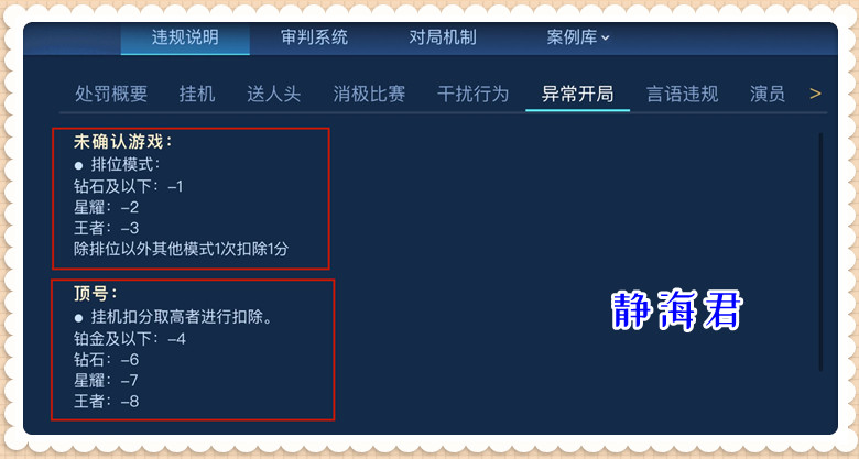 - 其二,如果在巅峰赛违规则最低要面临段位相关等级的处罚,某些特定的行为会扣更多的分。