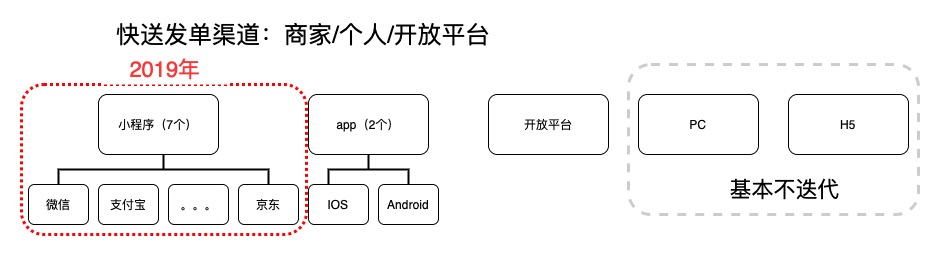 快送是给商家和个人用户发布同城运单的应用,包含小程序(7个渠道)和app(2个)、PC、h5、开放平台共15个端。