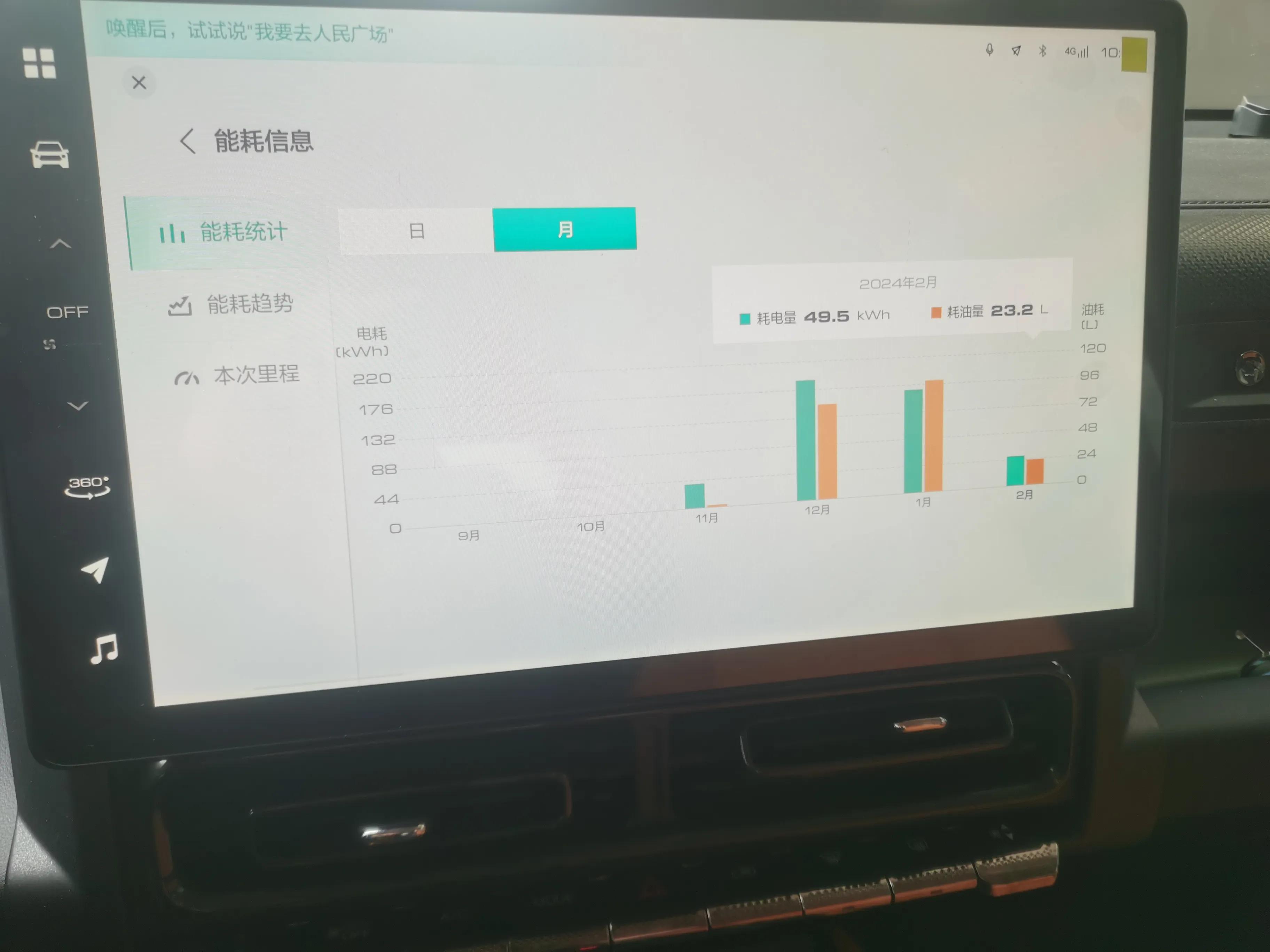 截止今天已加1900的油(燃油使用应该是1600元,昨天加的300元的油还没使用)。全部在外面充电,充电总花费450元。综上目前行车使用的能耗总成本为2050元,合计下来为0.38元/公里,总体来说这个能耗成本还是比较喜人的。下面附上在车机上拍下的几个月的能耗信息统计用作佐证: