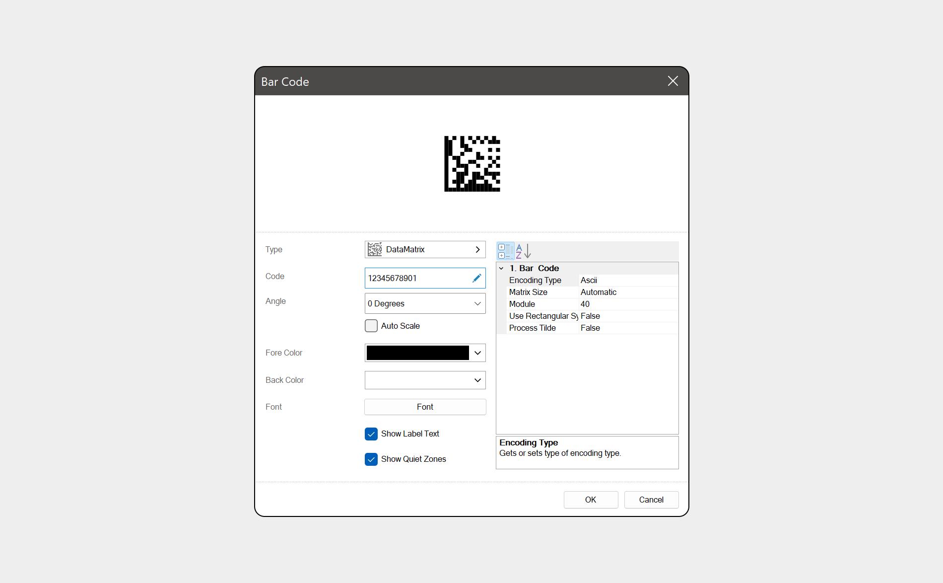 - “类型”选项卡显示条形码的类型(在本例中为 DataMatrix);