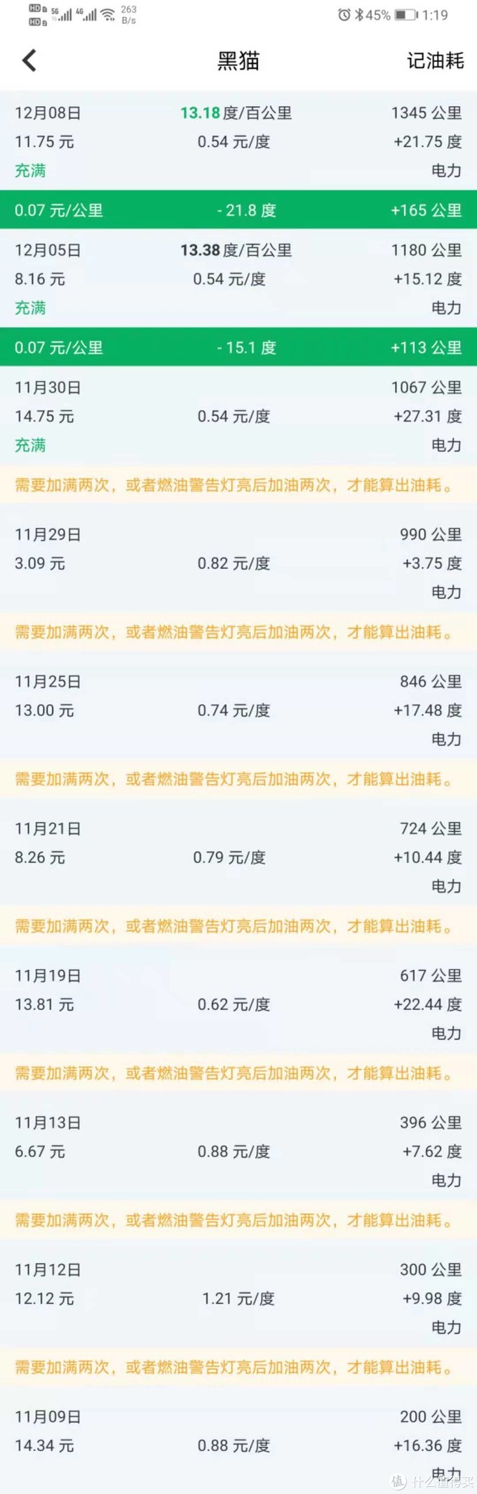 到12月8日,正好一个月时间,开了1345公里,充电105.95元,折合每公里7.88分钱。