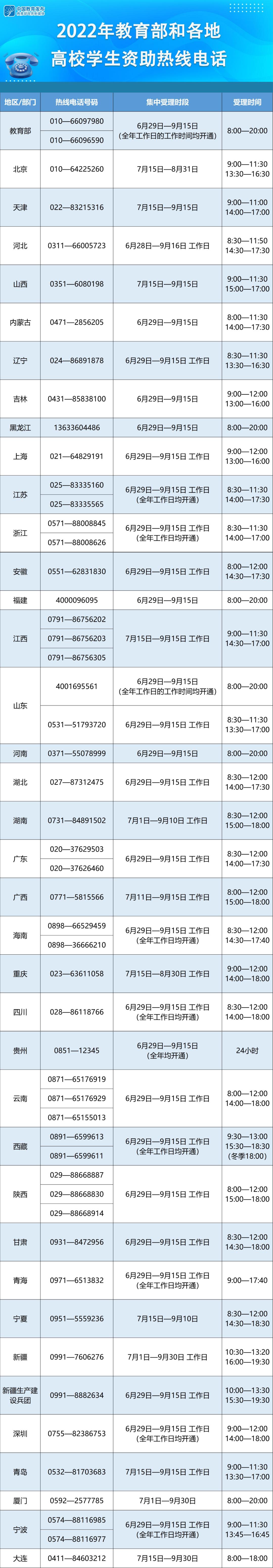 为帮助广大学生和家长及时准确了解国家资助政策,确保家庭经济困难学生顺利入学并完成学业。除了短信中提到的教育部热线电话外,各地学生资助管理中心和各中央部属高校也开通了暑期热线电话,小助附上一览表: