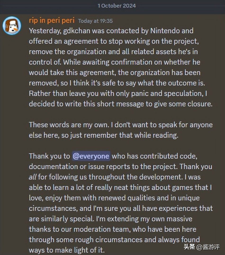 究其原因,还是任天堂的法务太强了,“龙神”开发者在社交软件Discord中留言,向各位玩家致谢的同时也透露了是任天堂法务要求他们彻底关闭该模拟器项目。