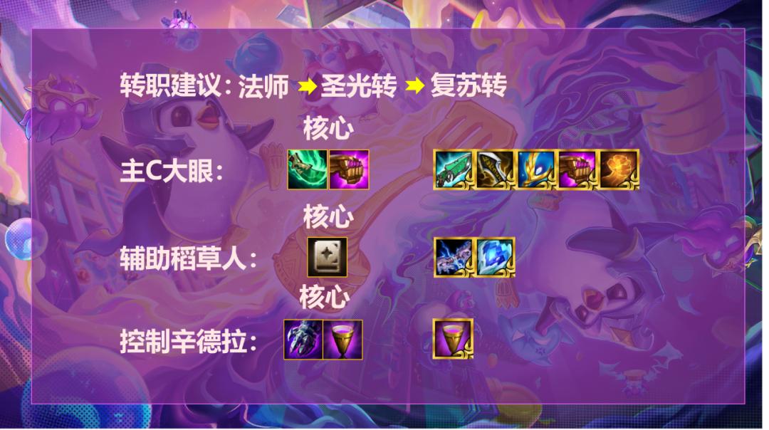 阵容羁绊组成3丧尸 3复生亡魂 3圣光 3秘术 2法师 2神谕 2斗士。这套阵容对铲子的需求度很高,可以说有铲子和没有铲子,这完全是两个阵容,稻草人拿到法转,开出4法羁绊,稻草人大招杀前排,大眼的射线秒杀一切后排,如果做不出法转,圣光转职以及复苏转职也是不错的选择,有圣光转职便可以下掉拉克丝开狗熊补足控制,或者开格纹为大眼减伤,均是不错的选择,对纹章之书的需求也是很高,打开纹章之书后选择的优先级;法转,复生亡魂转,圣光转,丧尸转,以及神谕转职,这些转职书虽然有排名优先级,不过能拿到的话对阵容的提升不容小觑。
