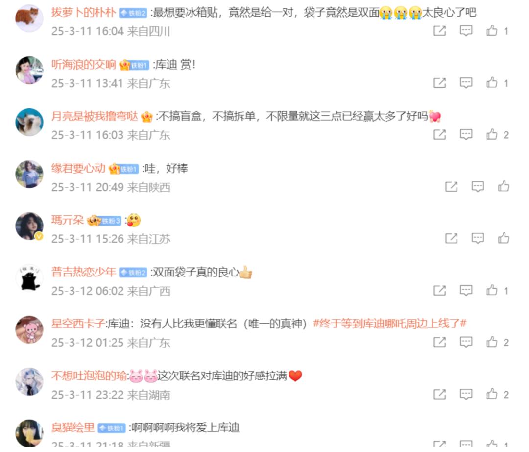 通过放大联名周边的消费“可得性”与品类“丰富性”,直接消解了消费者为集齐周边甚至隐藏款不断增加杠杆的消费焦虑,反而让库迪能够更高效地释放品牌联名的传播声量与转化势能并收获一大波来自年轻用户的好感。