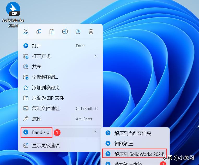 1、知识兔下载SolidWorks 2024软件安装包到电脑上,右键选择【解压到SolidWorks 2024\】