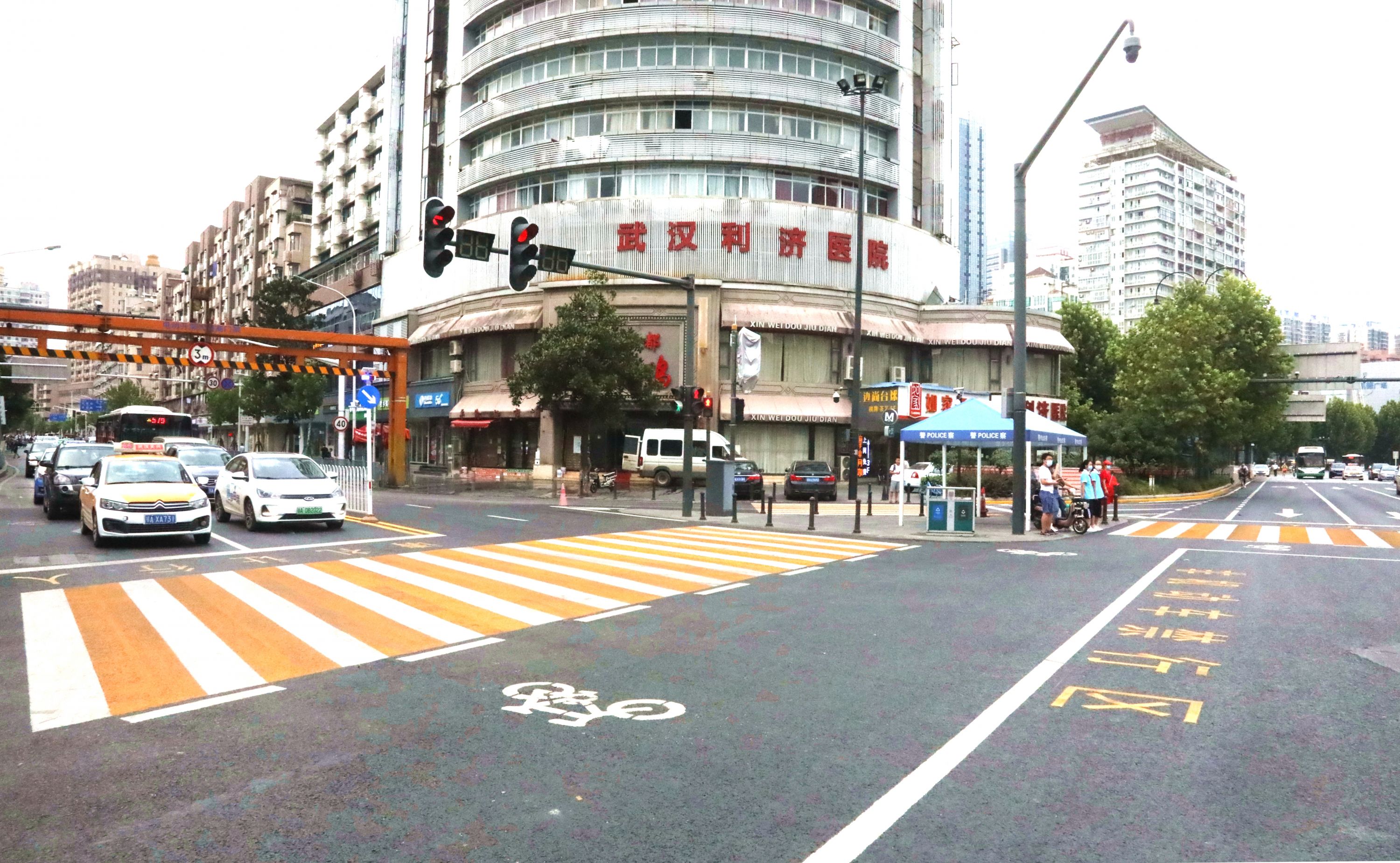 今年9月,黄白相间的彩色斑马线出现在利济路路口,行人和非机动车过马路有各自专门的区域,此后这样的彩色斑马线出现在武汉三镇。
