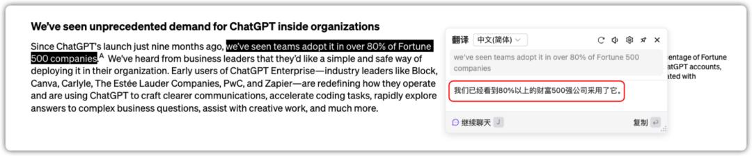 OpenAI今天早上发布企业版 ChatGPT 时用了一个数据:他们发现 80%的世界 500 强公司的团队已经在使用 ChatGPT 了。