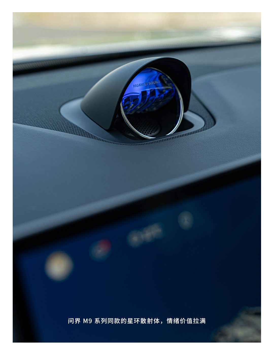新M5在内饰上加上了问界 M9 系列同款的星环散射体,可以跟语音助手、音乐、氛围灯做联动,主打一个陪伴,情绪价值拉满。