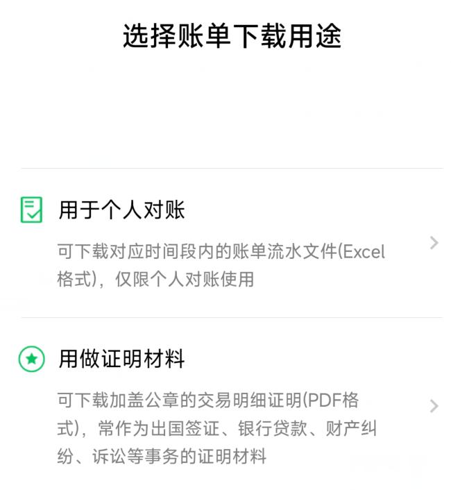 7.选择账单下载用途,有“用于个人对账(最长可以导出三个月的账单)和用做证明材料(最长可选择一年账单)”;