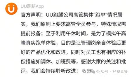 5月23日中午,UU跑腿官方发表声明确认:公司高管集体参与跑腿服务的情况确实存在。原则上,公司要求所有高管参与跑腿,特殊情况需提前报备。公司安排午休时间参与跑腿是为了模拟午高峰时段的真实工作体验,目的是让管理层亲身体验后更好地进行产品优化和改进。同时,公司对员工有相应的补偿措施,包括调休和加班费等。