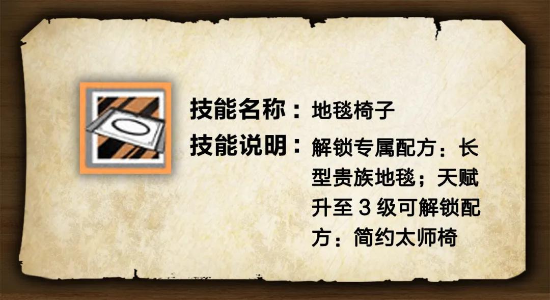 学习该技能后幸存者将习得长形贵族地毯的制作配方,当天赋升至3级时,可解锁配方——简约太师椅,找个家具工当室友,每天都有新家具哦。